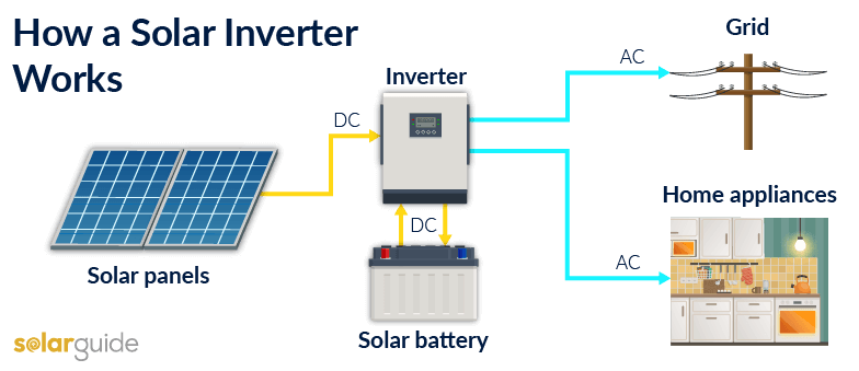 Solar Panels use photovoltaic (PV) cells to convert daylight into electricity. However, this electricity is in the form of a direct current (DC), while most household electrical devices operate from an alternating current (AC), so solar energy needs to be converted from DC to AC to power your home.